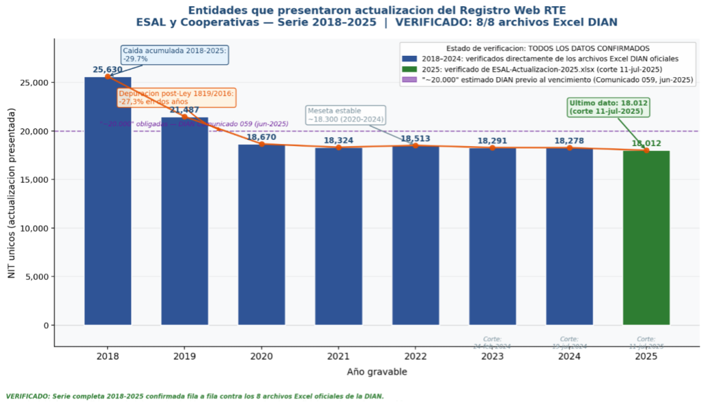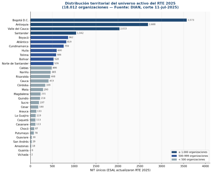 Llegamos a la cifra más pequeña pero no por esto la menos importante. Antes de empezar, una aclaración importante: la diferencia entre 338.055 registradas en Confecámaras para 2024 y las 18.012 (RTE activo para julio de 2025) no implica que el 94,7% de las ESAL sean inactivas. Implica que: (i) muchas ESAL no están en el RTE (operan en régimen ordinario); (ii) el sector solidario tiene pertenencia automática al RTE, pero algunos no actualizan este registro; (iii) una fracción de las ESAL registradas puede ser inactiva de facto sin haber cancelado su matrícula.