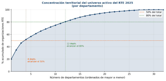 Y si lo valoráramos en términos del número de organizaciones sobre los departamentos, encontramos que de las 18.012 con Régimen Tributario Especial activo a 2025, 4 departamentos congregan el 50% de las ESAL con registros activos, mientras que 12 alcanzan el 80%. Esto refleja un importante nivel de concentración en ciudades principales, que deja a capitales intermedias y sus departamentos con registros activos menores.