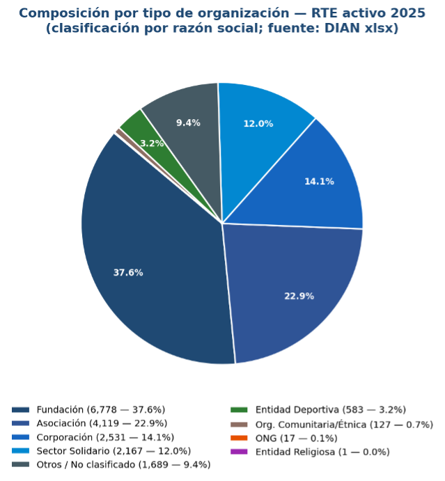 Si tomamos el Excel de actualización del Régimen Tributario Especial de la DIAN con sus registros a julio de 2025 y hacemos una clasificación por tipo, obtenida del análisis de la razón social de cada entidad en el Excel con el apoyo de la IA Claude, de Anthropic, evidenciamos que las fundaciones son el tipo más frecuente en el RTE activo (37,6%), seguidas de asociaciones (22,9%) y corporaciones (14,1%). El sector solidario representa el 12,0%.